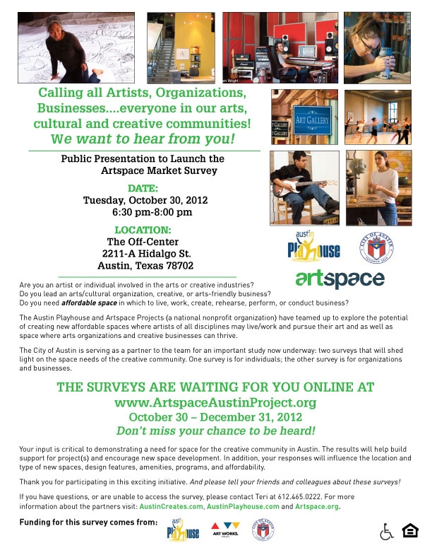 On Tuesday October 30th at 6:30pm, The City of Austin, in partnership with Austin Playhouse, and Artspace, will launch the survey with a public presentation.